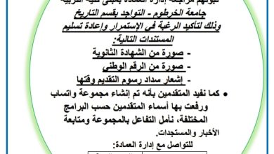 عمادة التعليم عن بعد بجامعة الخرطوم تعلن بدء التقديم للدراسة عن بعد للعام 2024–2025 من 30 ديسمبر حتى 30 يناير. تعرّف على البرامج المتاحة، شروط…